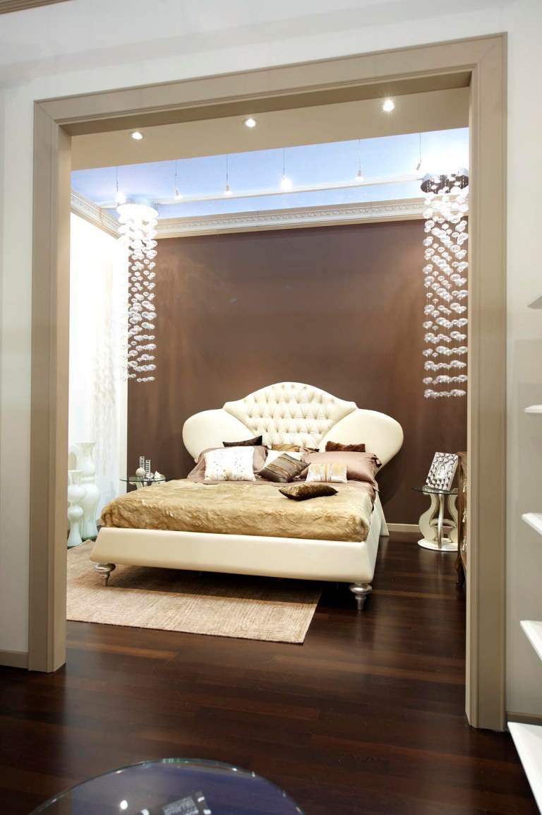 Double bed from Italian manufacturer Busatto. The model is made on a frame of solid wood. The legs are made of metal painted in silver color. Headboard sculpted shape is covered in a skin of white. The model is decorated with ornamental stitch-Capito. The bed is made in classic style.