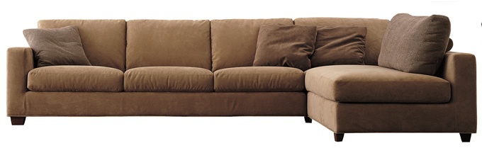 Canapone corner sofa from Italian manufacturer Arketipo. The frame of this model of the sofa is made from wood. The upholstery is presented in a leather and textile version. Color sofa orange and brown.