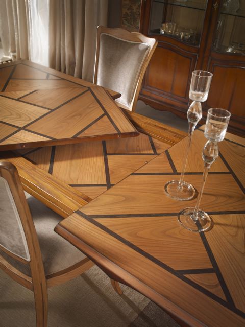 Dining table from the Italian manufacturer Busatto. Model on high curved legs. The table-top of rectangular shape with additional sliding insert. Material - solid wood. Finishing is made with glossy varnish. In addition the dining chairs are available in the same design.