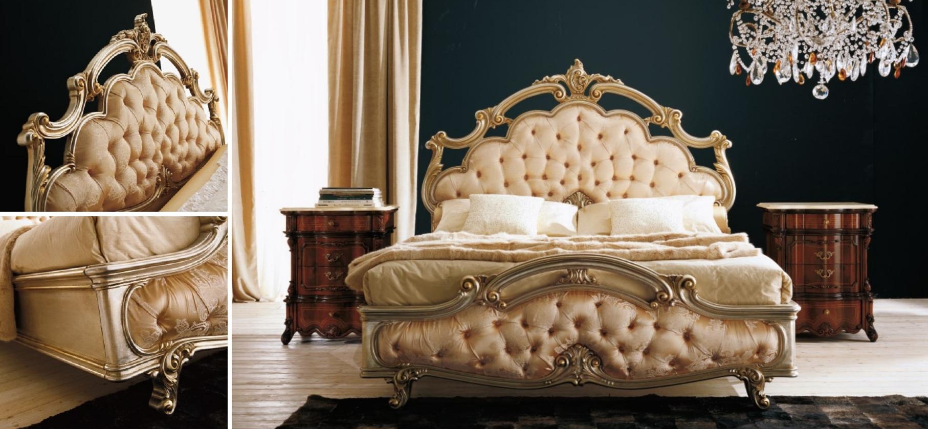 Headsets for bedrooms from Italian manufacturer Grilli. Set includes: double bed with soft headboard and bedside tables. The frames are made of wood. Upholstery - textiles. Headboard decorated with carvings and stitch Capito. The legs are decorated with carvings. Finish - gold and silver. Set is made in a classic style.