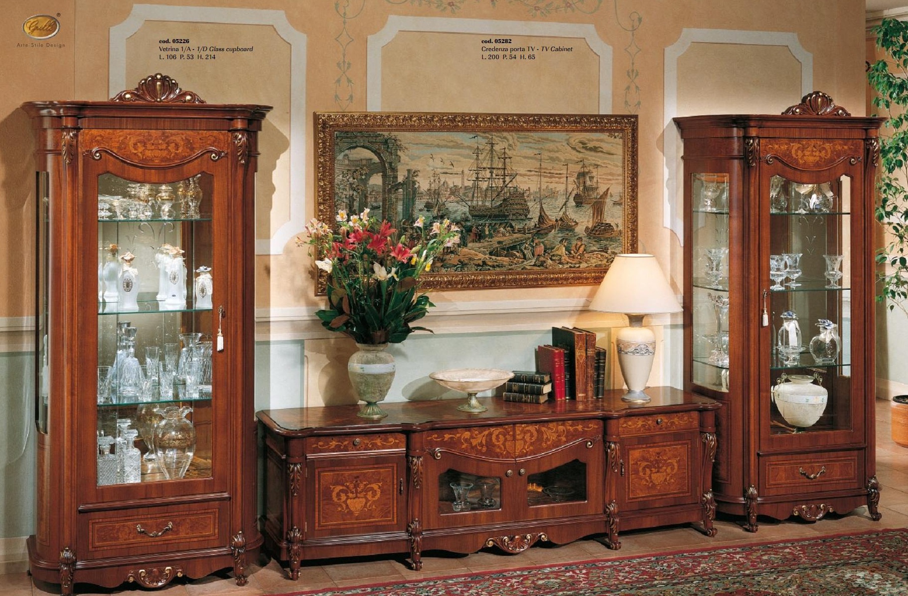 Set for the dining room, from the Italian manufacturer Grilli. Set includes: two display cases and furniture for TV. The frames are made of wood. Door glass. The set is decorated with carved elements. Typefaces perfectly complement the classic interior of dining room or living room.