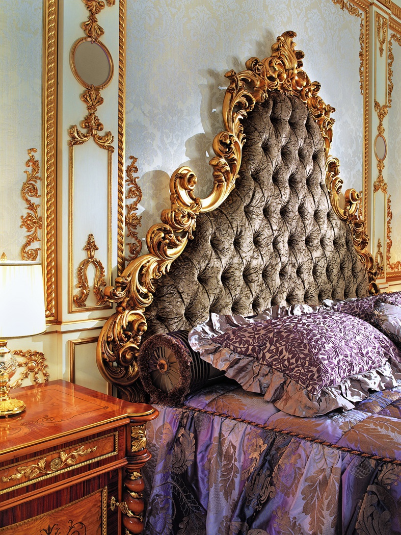 Double bed from Italian producer Carlo Asnaghi. Model with high headboard triangular shape. The frame is made from solid wood. Headboard completely covered with textiles and is embellished with stitch-Capito. The elegance and luxury models emphasize the figure elements painted in Golden color. The bed is made in classic style.