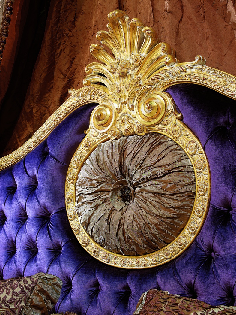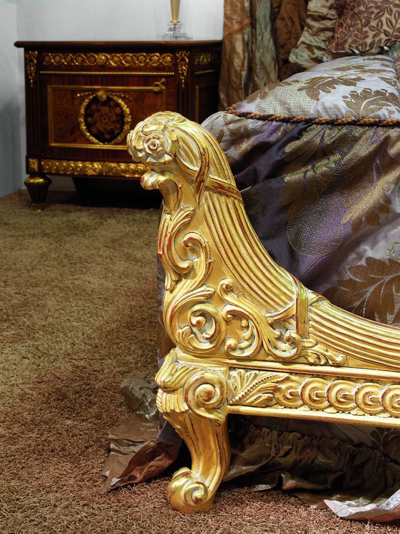 Double bed from Italian producer Carlo Asnaghi. The model is made from wood. The head is covered with curly textile and edged with wood. The model is decorated with ornamental stitch-Capito and the flower is made of textile. Finish offered a choice from a range of firms. The bed is made in classic style.