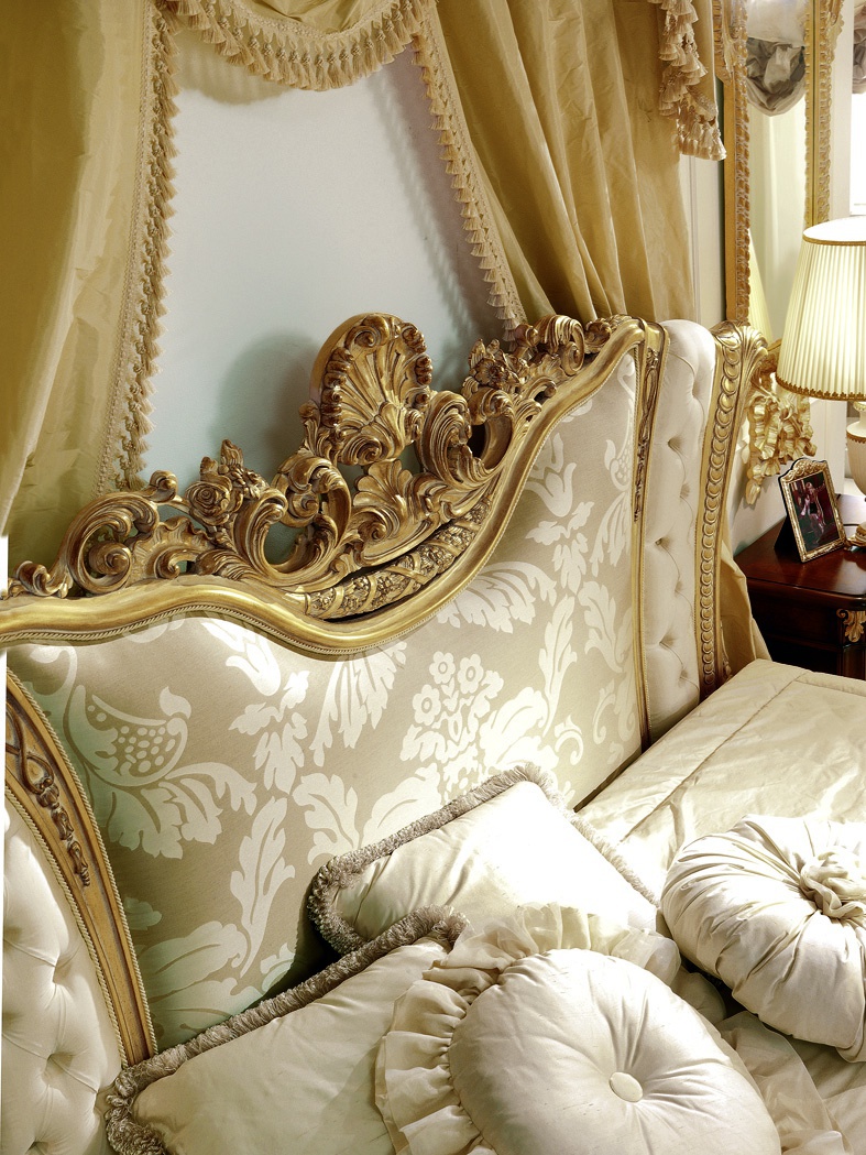 Double bed from Italian producer Carlo Asnaghi. The model is made in classic style. The frame and legs are made of solid wood. In finishing in the colour gold. High headboard is decorated with carving and covered with textiles. On the side design complements a decorative stitch-Capito. Elegant, comfortable and practical model will perfectly fit the interior of your home.