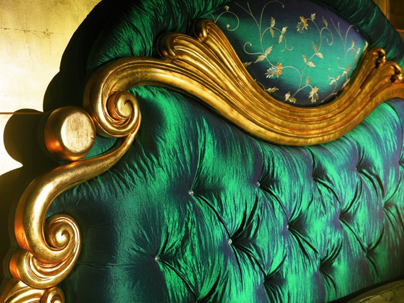 Double bed from Italian producer Carlo Asnaghi. The model is made in classic style. The frame is made from solid wood. The head of the semicircular form is covered with textiles. The ornament serves as a decorative stitch-Capito and the insertion of carved wood covered with gold leaf.