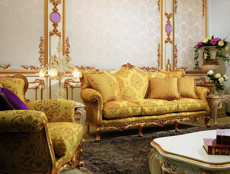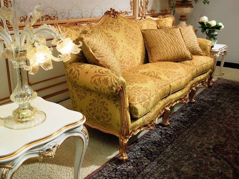 Three seater sofa from Italian producer Carlo Asnaghi. The model is made from wood finish in the color gold. The armrests in the form of scrolls. Upholstery offers fabric light shades. The model is decorated with ornamental carving done by hand. Sofa in classic style.