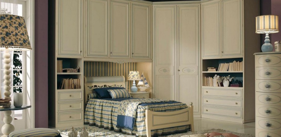 Set for children's bedroom Camerette, Italian manufacturer Ebanisteria Bacci. Set includes: bed with upholstered headboard, a nightstand, a modular system for storing clothes and books, a chest of drawers. Frames made of natural wood. Finishing varnish from the company portfolio. Colors: blue and white. Set is made in a classic style.