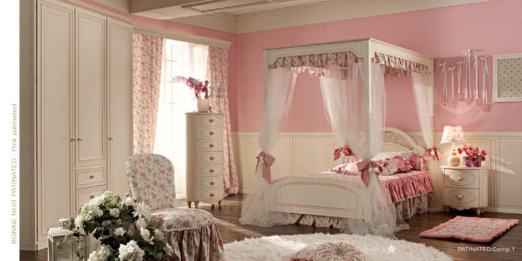 Set for children's bedrooms Patinated, from the Italian manufacturer Ebanisteria Bacci. Set includes: bed with high headboard and four-poster bed, a nightstand, tall dresser, a chair upholstered, . Frames made of natural wood. Finishing varnish from the company portfolio. Colors: pink and white. Set is made in a classic style.