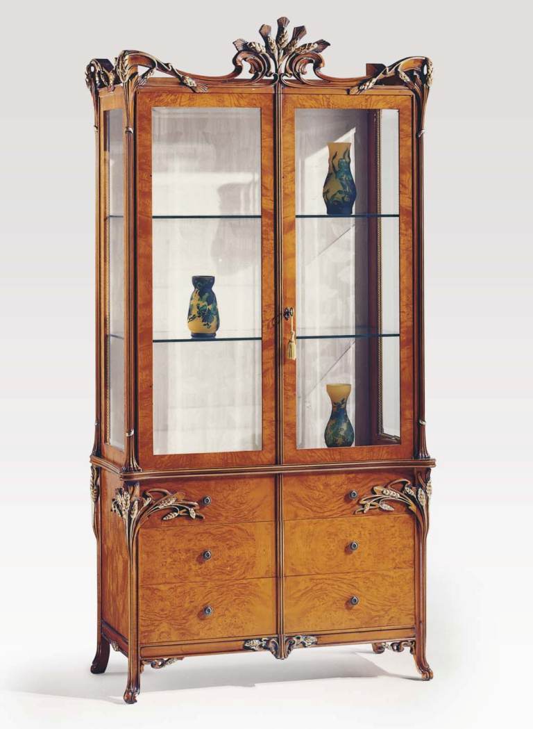 The sideboard from the Italian manufacturer C. L. Italia. The model consists of drawers and shelves for storage. The frame is made from solid wood. The finish is offered under the color of natural wood. Shutters and shelves made of glass. Handles made of metal. They are decorated with carved elements. Made in the style of art Nouveau.