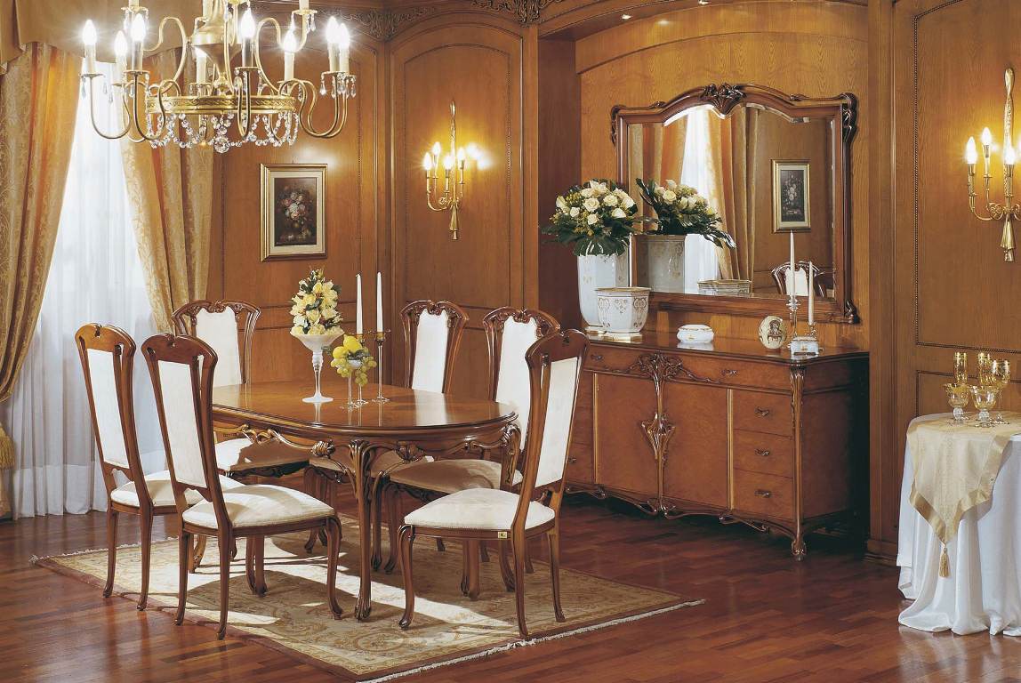 For a dining room set from the Italian manufacturer C. L. Italia. Consists of dining table and 6 chairs. Material - solid wood. The finish offers a glossy varnish. The table is decorated with a decorative carving. Chairs fabric in white colour. Set is made in liberty style.