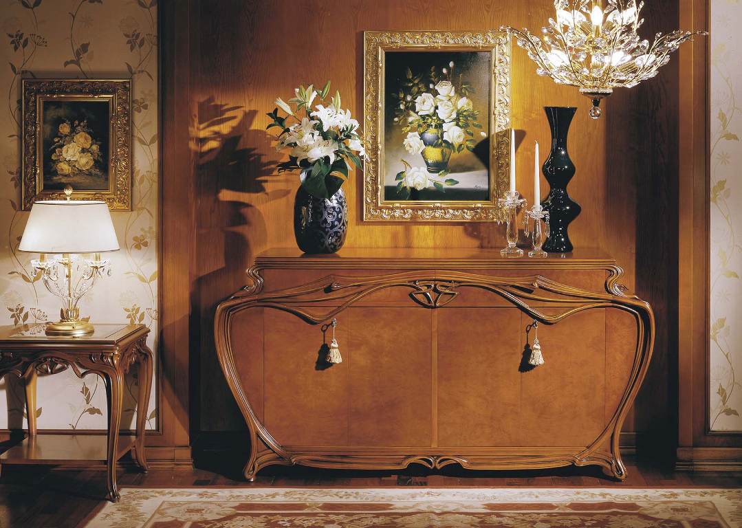 A chest of drawers from the Italian manufacturer C. L. Italia. The model of the original form. The frame is made from solid wood. Finish - natural wood color. The doors are locked. The model is decorated with decorative carvings.