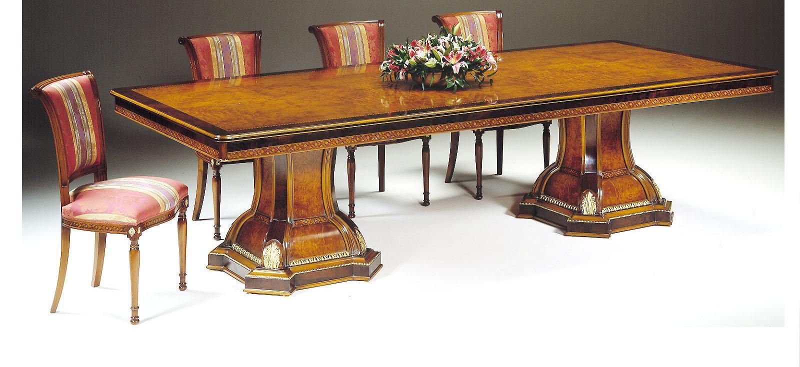 Dining table from the Italian manufacturer Citterio. Model on massive pillars. The table top is rectangular. The model is made of solid wood. Finish - gloss lacquer. In addition to models are offered chairs in fabric. The table is made in classic style.