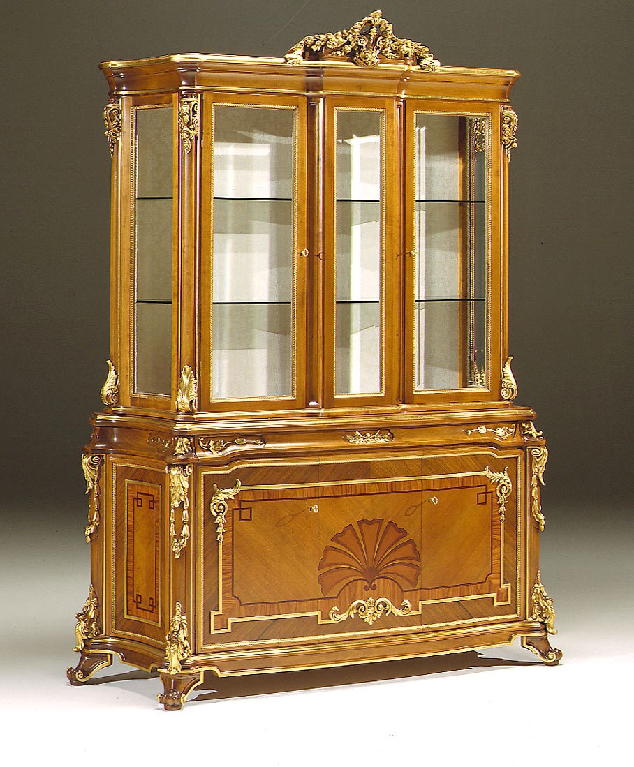 The buffet from the Italian manufacturer Citterio. The model is made on a frame of solid wood. Shutters, sides and shelves are made of glass. The model is decorated with carved elements and gold-plated. The doors are locked. A snack bar is made in classic style.