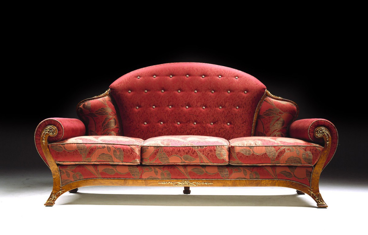 Three seater sofa from Italian manufacturer Citterio. The model is made on a frame of solid wood. The model feature a high semi-circular back. The armrests in the form of scrolls. Upholstery textile from the company portfolio. The back is decorated with stitch-Capito. The seat cushion is removable. Sofa in classic style.