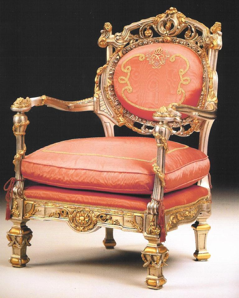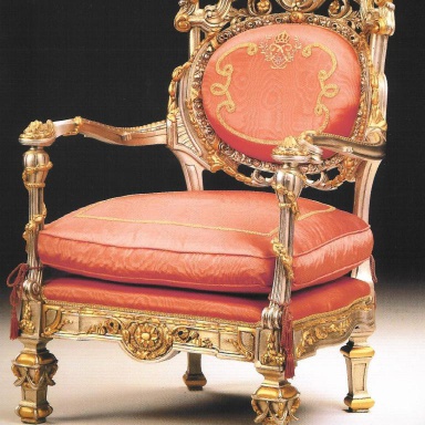 A chair from the Italian manufacturer Citterio. The model is on a metal frame. Finish offered a Golden color. Upholstery textile of red color. Seat cushion is removable. The model is decorated with carved and twisted elements. The chair is made in a classic style.