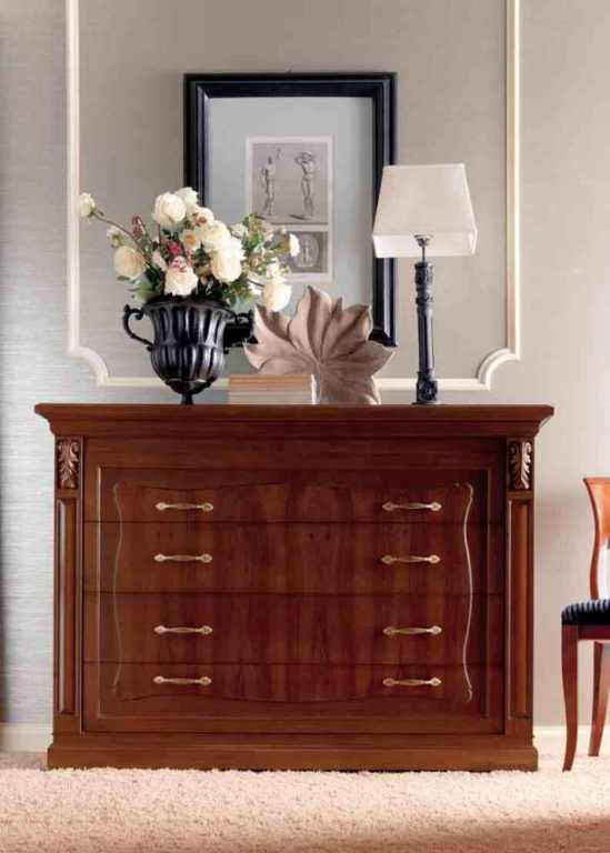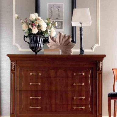 A chest of drawers from Italian manufacturer Formichi. The model consists of four drawers. The frame is made from solid wood. Finish - gloss or Matt lacquer. Decorative accessories made of metal. The model is decorated with hand-carved. The chest is made in a classic style.