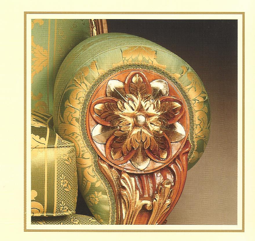 A chair from the Italian manufacturer Citterio. The model is made in classic style. The frame is made of wood. Color finish offers the natural wood. The armrests and back are rounded. The upholstery is made of textiles from the assortment of the company. The model is decorated with hand-made carving painted in Golden color.