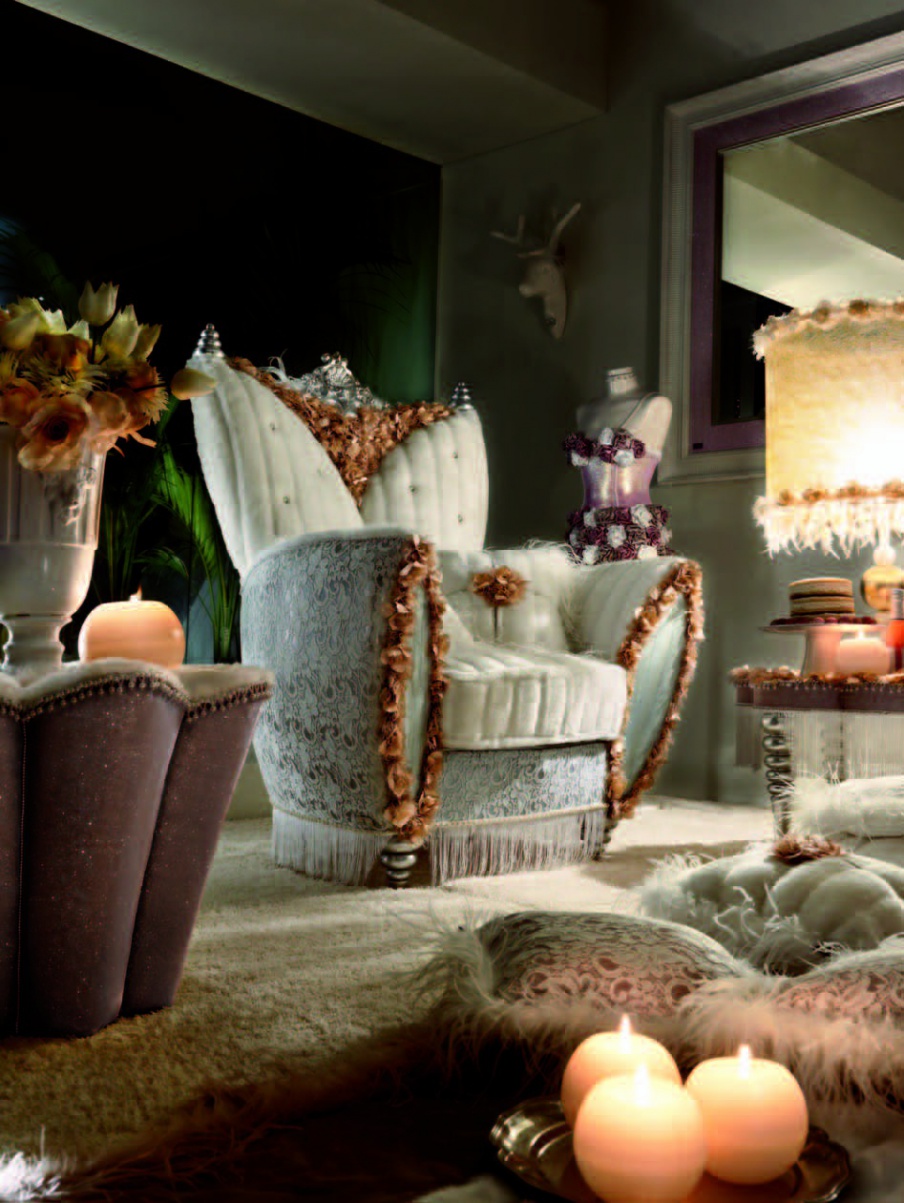 A chair from the Italian manufacturer AltaModa Model with a hidden frame. Upholstery textile is proposed. Color finishes are offered from a combination of white and brown colors. The back is ornately shaped with decorative carving.