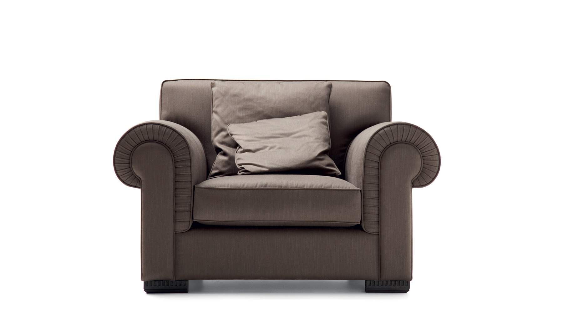 A Ruggero armchair from Italian manufacturer Angelo Cappellini. The frame is made from solid wood, filler - foam, upholstery - textiles from a range of campaigns. A great model for living room in modern style. The design of complementary decorative pillows. Colours in stock.