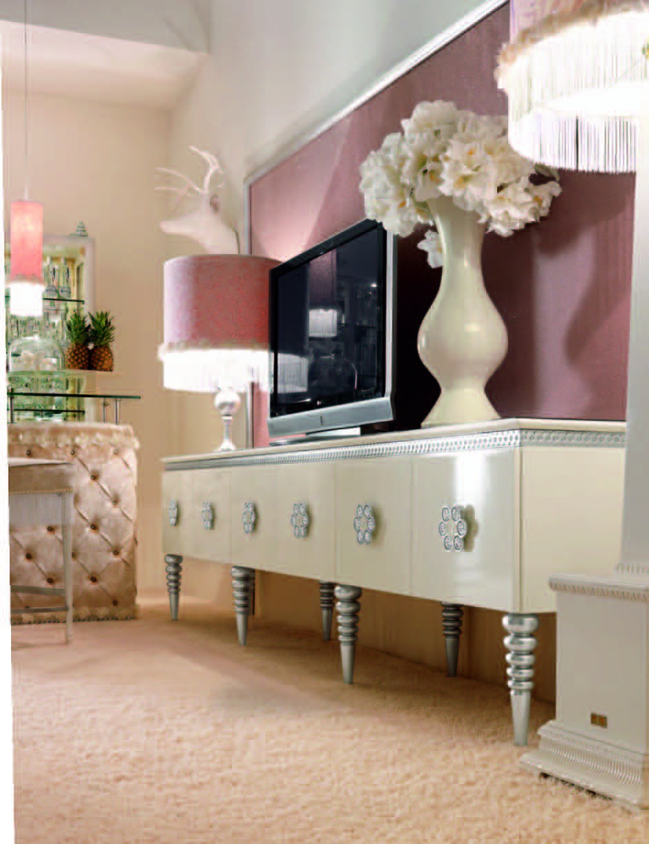 A chest of drawers from Italian manufacturer AltaModa. The body is made of solid wood in gloss lacquer finish, legs - metal. A model with swing doors. The design complements decorative fittings in the form of a flower. The perfect choice for a living room in modern style. Product color ivory.