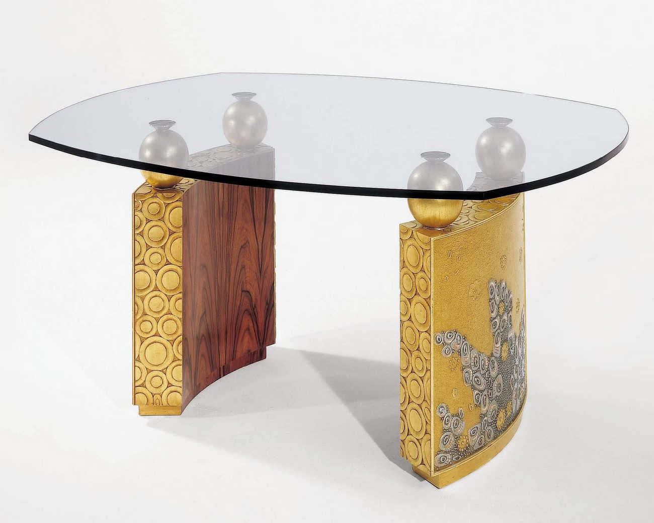 Table from Italian manufacturer Colombo Stile. The frame is made from solid wood. Worktop - glass. Original model, made in a modern style, decorated with unusual ornaments that will give your dining room a special look.