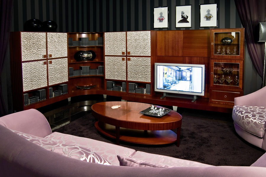 Sofa set Chic Cubica, from Italian manufacturer Minotti Collezioni. Set includes: oval coffee table, chair with the pink upholstery and a modular system for storage and TV. The frames are made of wood. Upholstery - textiles. The set is made in art Deco style.