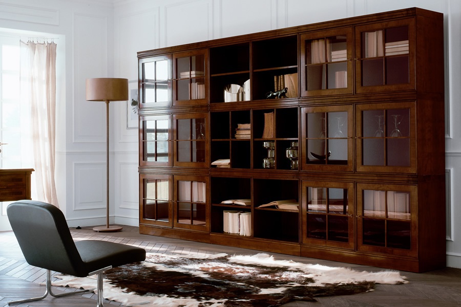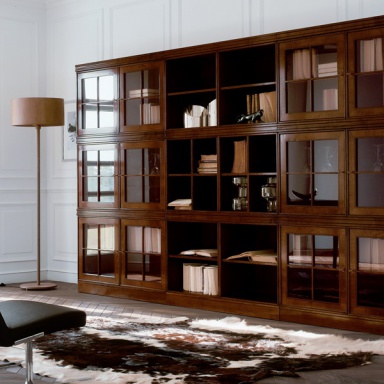 Wall Easy Cubica from Italian manufacturer Minotti Collezioni. The frame is made of wood. Finishing varnish from the company portfolio. The model contains a large number of shelves and drawers. The system is designed in a classic style.