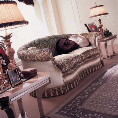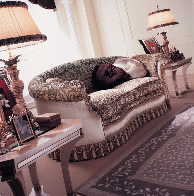 Sofa set from the Italian manufacturer Jumbo Collection. Set includes loveseat & side table. The furniture is made of solid wood, filler - foam, upholstery - textiles from a range of campaigns. The seats are removable. The base is hidden a decorative "skirt". Colours in stock.