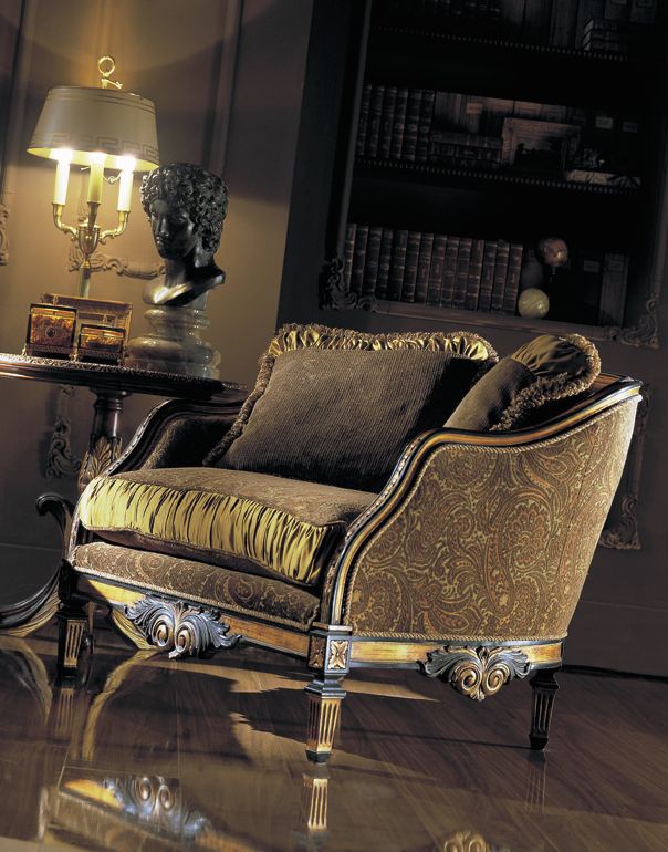 The chair of the Temptations from the Italian manufacturer Jumbo Collection. The frame is made from solid wood in carved decoration, the seat filler - foam, upholstery - textiles from a range of campaigns. The seat is removable. The design of complementary decorative pillows. The model is designed for the living room in a classic style. Colours in stock.