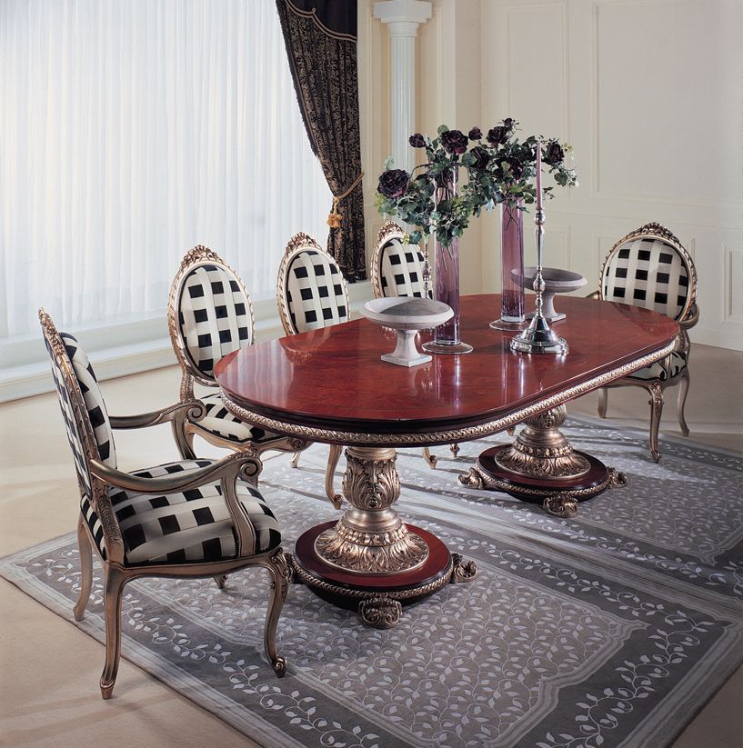Set for the dining room from Italian manufacturer Jumbo Collection. Set includes dining table and chair. The furniture is made of natural wood. Upholstery - textiles from a range of campaigns. Finish options: carved/gold leaf/gloss varnish. Colours in stock.