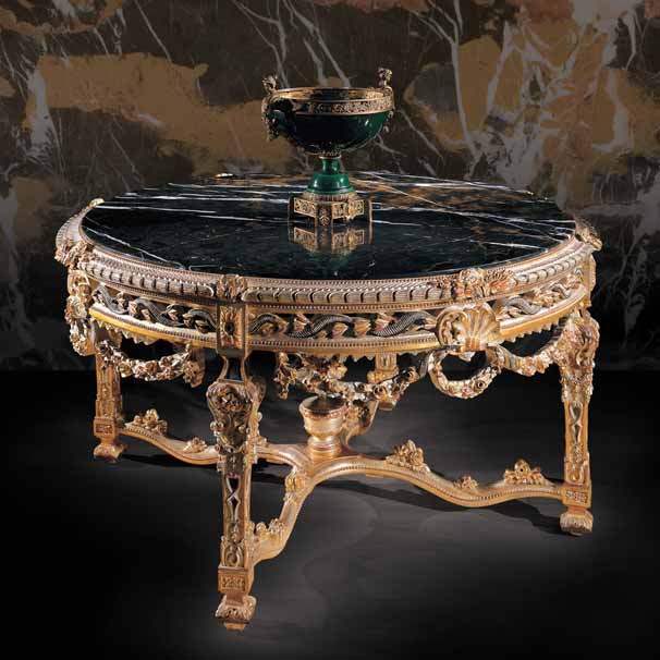 | Description: | Round table from Italian manufacturer Ezio Bellotti. Frame of table is made of real wood, finish - oro antico con argento. Marble top. The model is decorated with decorative carvings. The model is made in a classic style and can serve as a dining and coffee table. |