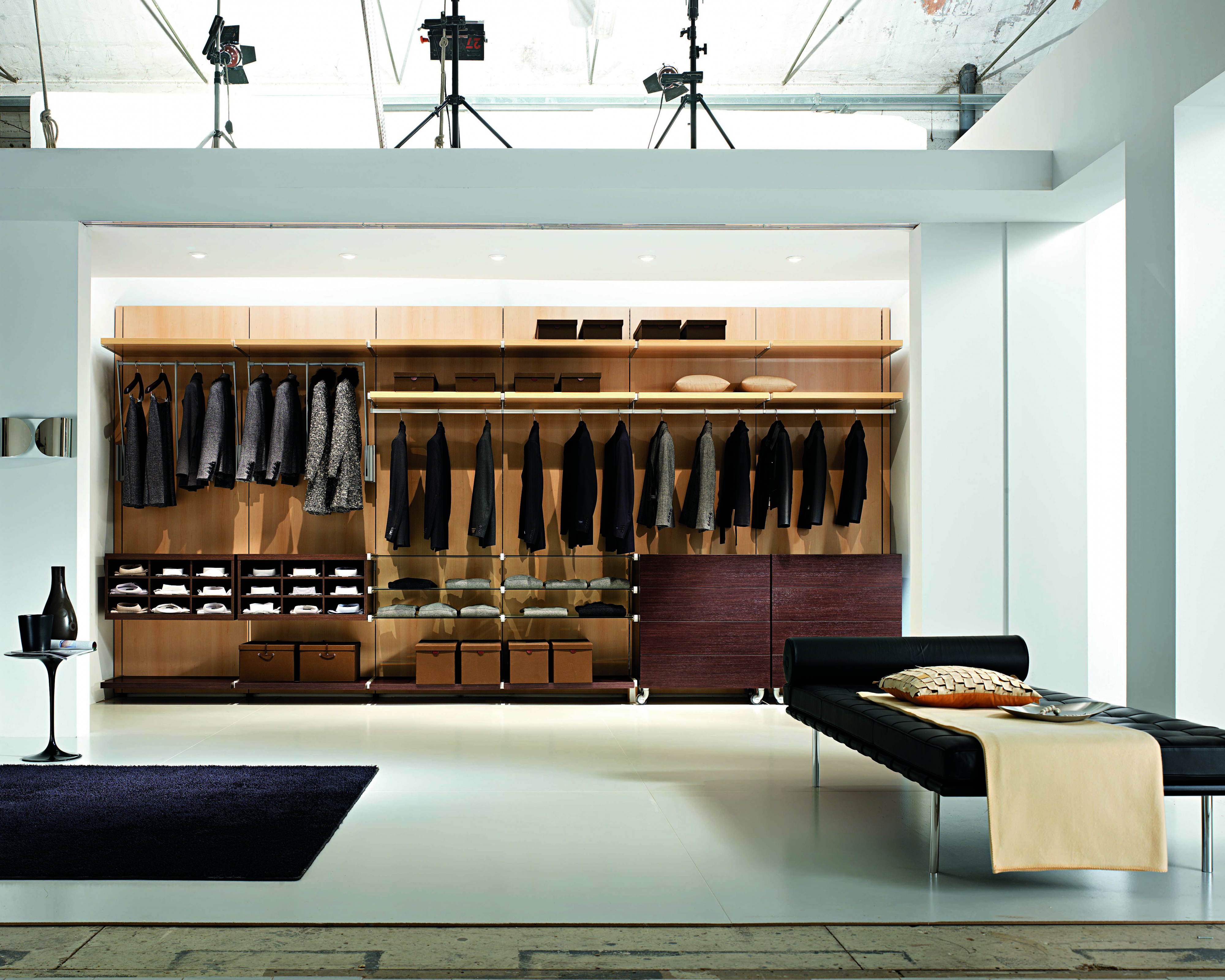 Dressing room, from the Italian manufacturer Mercantini. The frame is made of wood and metal. The model is made with different drawers, shelves and other elements for storing clothes. Colors - brown and beige. The style is modern.