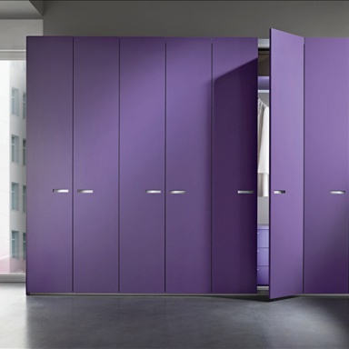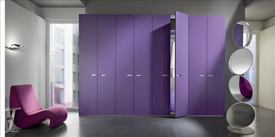 Wardrobe, from the Italian manufacturer Mercantini. The frame is made of wood. Finish - gloss lacquer from the company portfolio. Colors - fioletowy. The model is made with eight hinged doors, a built-in handle.