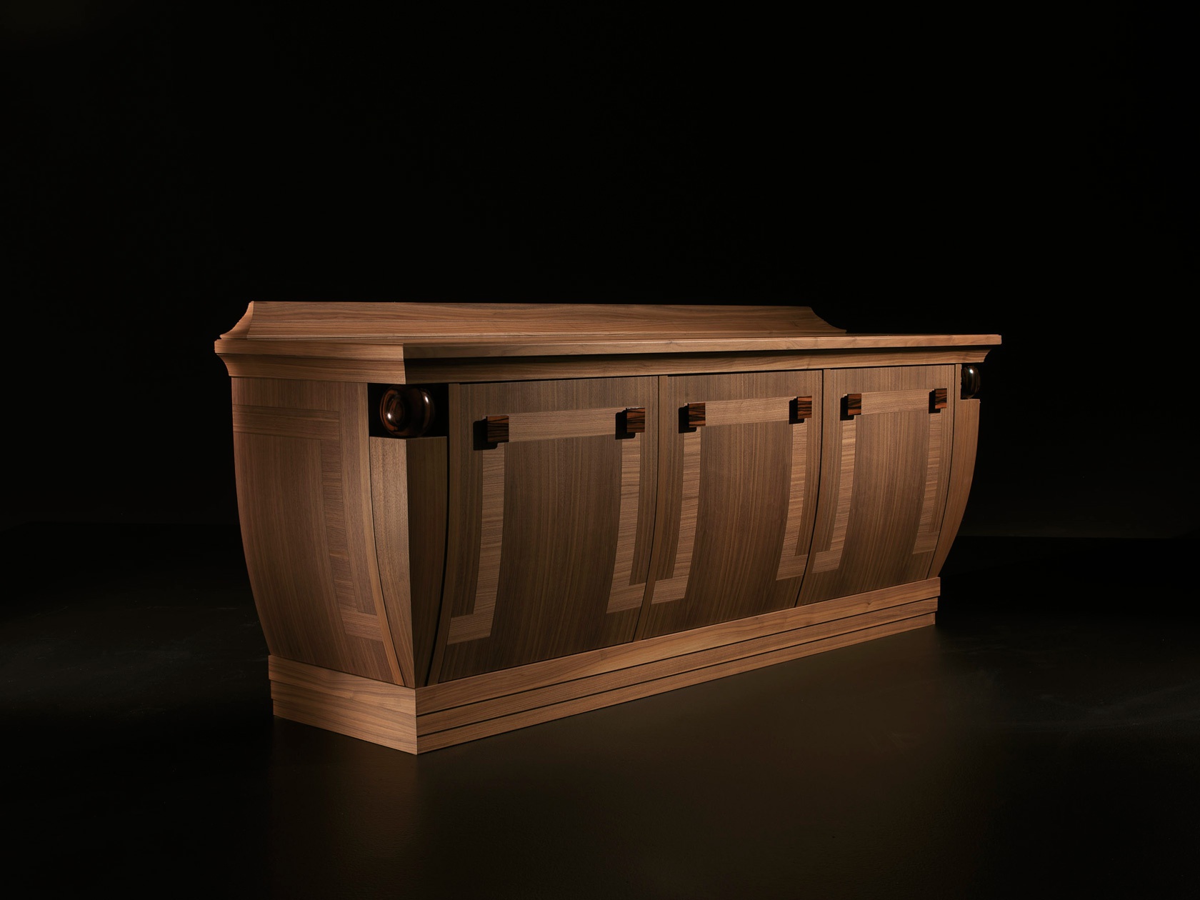 A chest of drawers from the Italian producer Galimberti Nino. Model with three internal drawers and cupboards with hinged doors. Material - solid wood American walnut. Color finish offers the natural wood. The model is decorated with decorative elements made of ebony Makassar. Made chest of drawers in art Deco style.