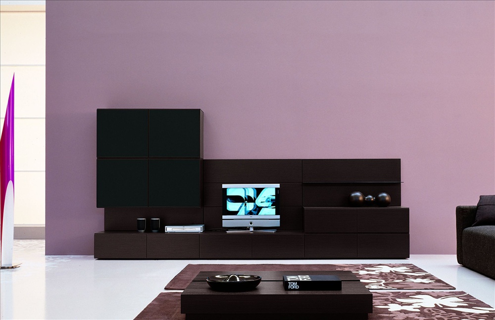 Modular system for the living room, from the Italian manufacturer Md House. The frame is made of walnut. Finish - gloss lacquer from the company portfolio. Colors: brown, black. The model consists of floor and wall units with various shelves and place for TV. The system is designed in a contemporary style.