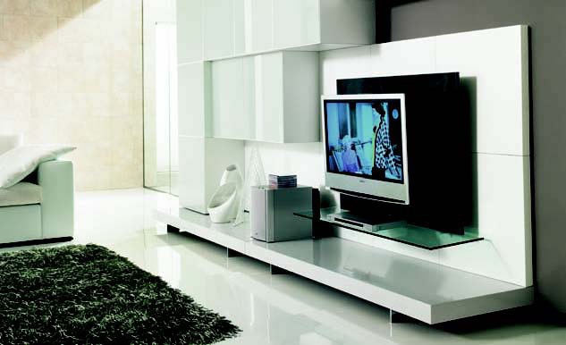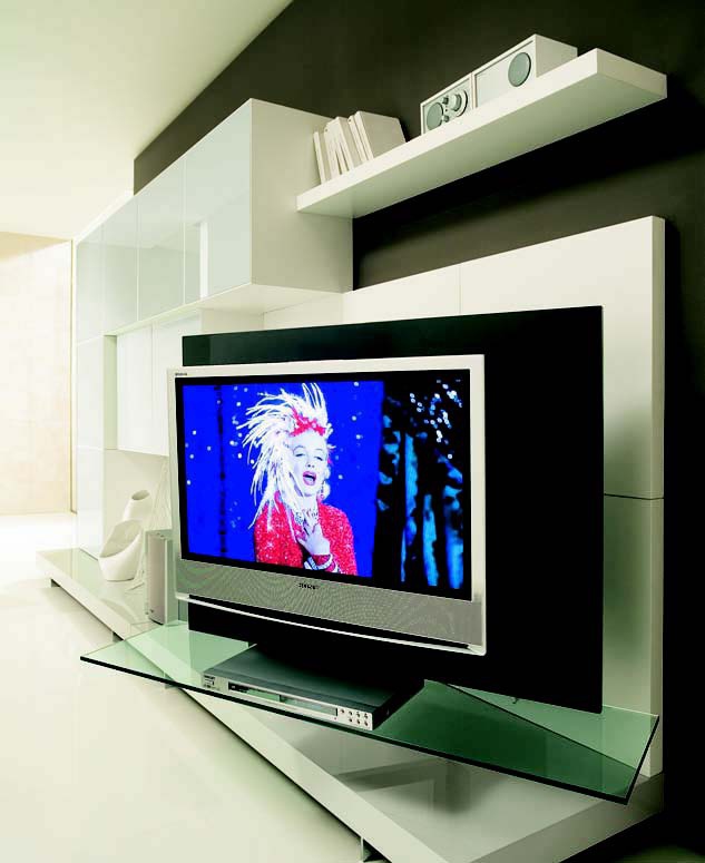 Modular storage system from Italian manufacturer Prealpi. In this model, a designated place to install the TV and all related accessories. Represented by the variant model in white color. Contain shelves for storing books and closed cabinets square shape.