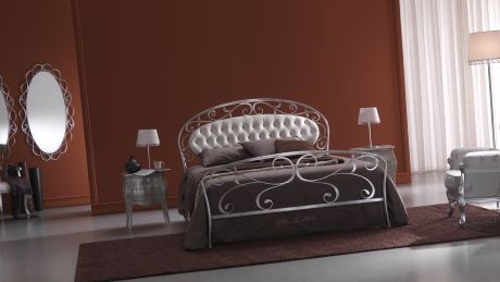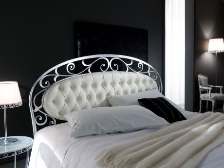Acanto bed from Italian manufacturer Bontempi Casa. For the frame is metal. Wrought, antique bed with high upholstered headboard with silver elements and gold. The model with the footboard.
