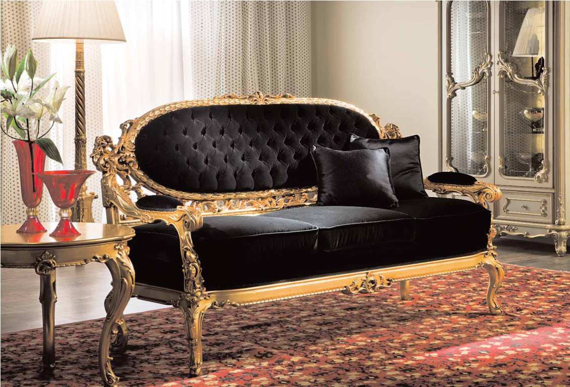 Triple Dedalo sofa from Italian manufacturer Silik. Model on a frame of solid wood, painted in Golden color. Seat and back are covered with black textile. The back is decorated with ornamental stitch-Capito. The model is decorated with carvings. In addition offers decorative pillows. The model is made in classic style.