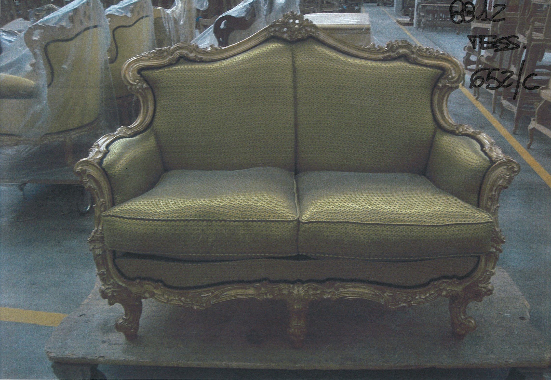 | Description: | Double sofa Omero . The frame is made from solid. Filling - polyurethane foam of different densities. The backrest, armrests and base are decorated with a hand-carved finish white gold with lighter shades of code 38. Upholstery textile 652/C |