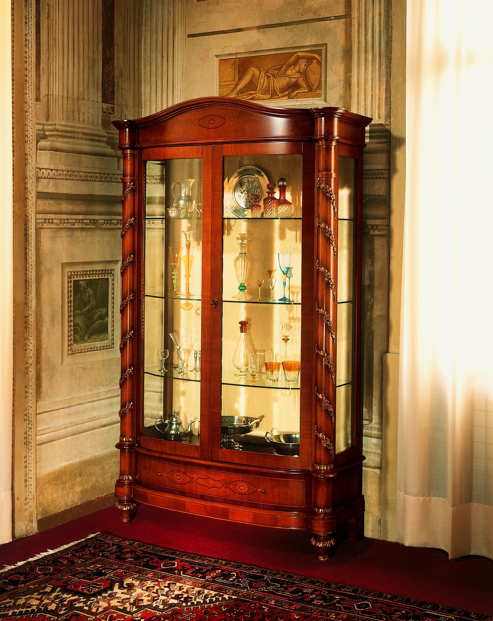 case: natural wood shelves, doors: glass finish: lacquered elements of decor: gilding |