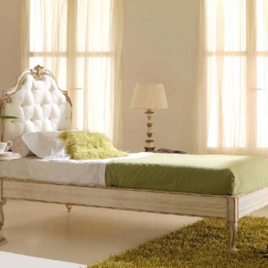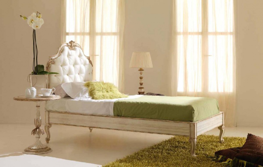 Single bed from Italian producer Silvano Grifoni. Model on figured legs. The frame is made from solid wood. Color finish is offered in white and Golden color. The headboard is covered with white textile. The ornament serves as a decorative stitch-Capito and hand carved. The bed is made in classic style.