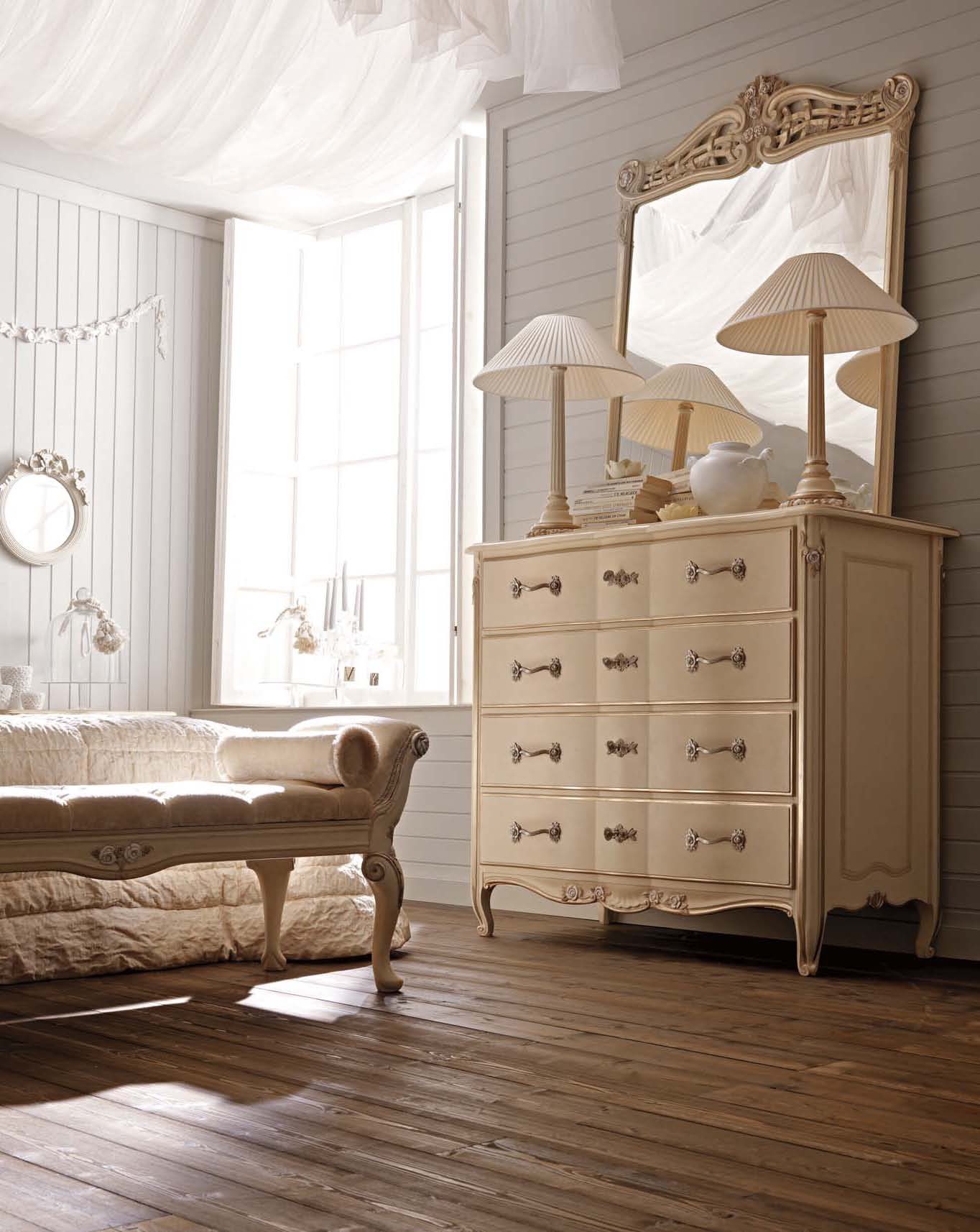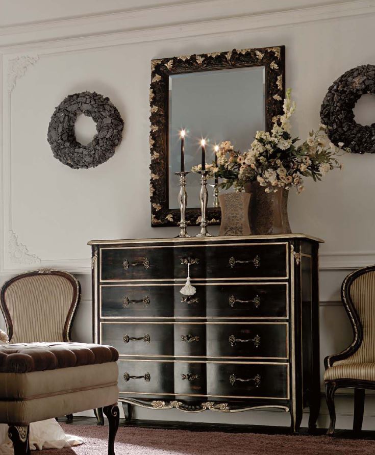 The Ambiente Notte chest of drawers from Italian manufacturer Savio Firmino. Dresser with drawers on small feet made in the classic style. Decor serves fine hand carved and gold leaf. The product is designed for linen storage. Model color beige/black with gold elements.