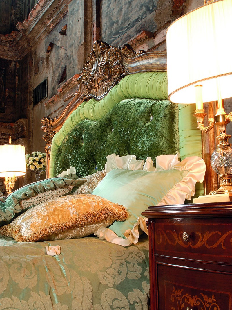 Set of bedroom furniture from the Italian manufacturer Ramplodi. Set in a classic style consists of several pieces of furniture: a double bed with high upholstered headboard and is made of solid wood rare breed, carved handmade, upholstery - decorated textiles; a chest of drawers and bedside tables also made of solid wood, decorated with original ornaments. The set will perfectly complement and enrich a classic interior of your bedroom.