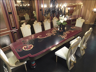 Dining table from the Italian manufacturer Mida. Made in the style of Glamour. Frame made of wood. The table top is decorated with floral ornament. Colours: combination of black and maroon with the addition of gold elements.