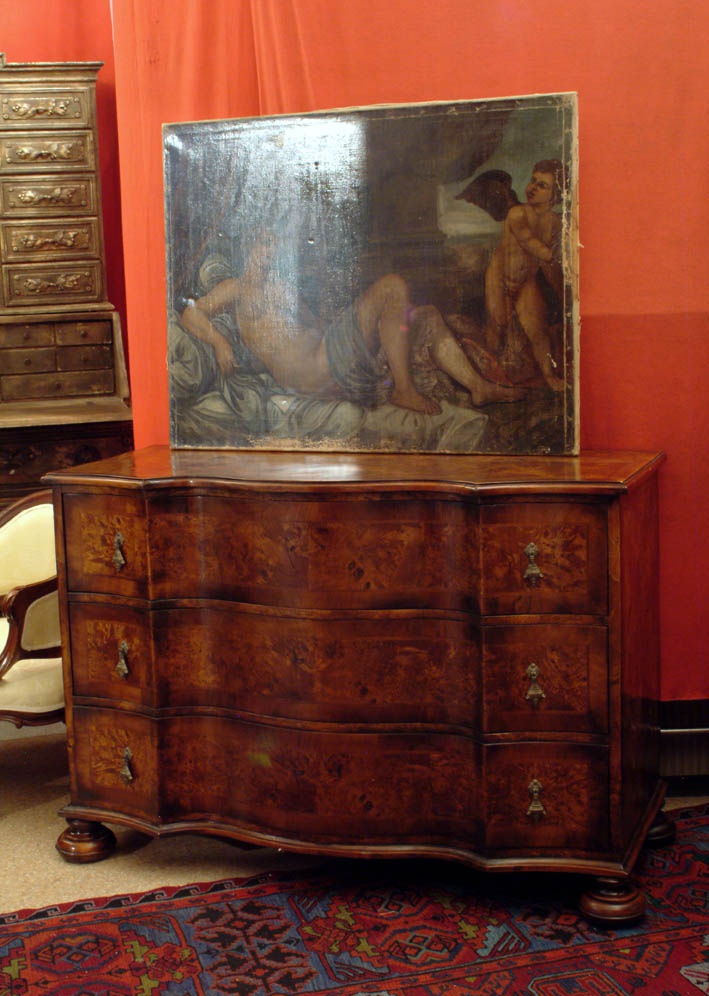 A chest of drawers from Italian manufacturer Mice. The frame is made of wood. Finishing varnish from the company portfolio. Colors: natural wood color. Drawers complemented with metal fittings in a classic style.