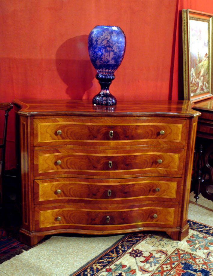 A chest of drawers from Italian manufacturer Mice. The frame is made of wood. Finishing varnish from the company portfolio. The model consists of four boxes. Drawers complemented with metal fittings and key.