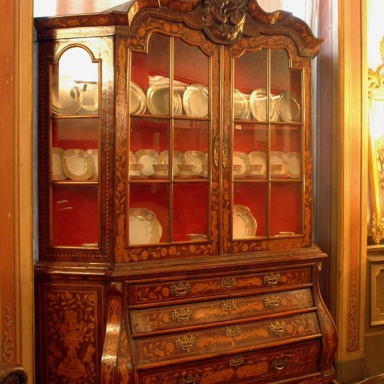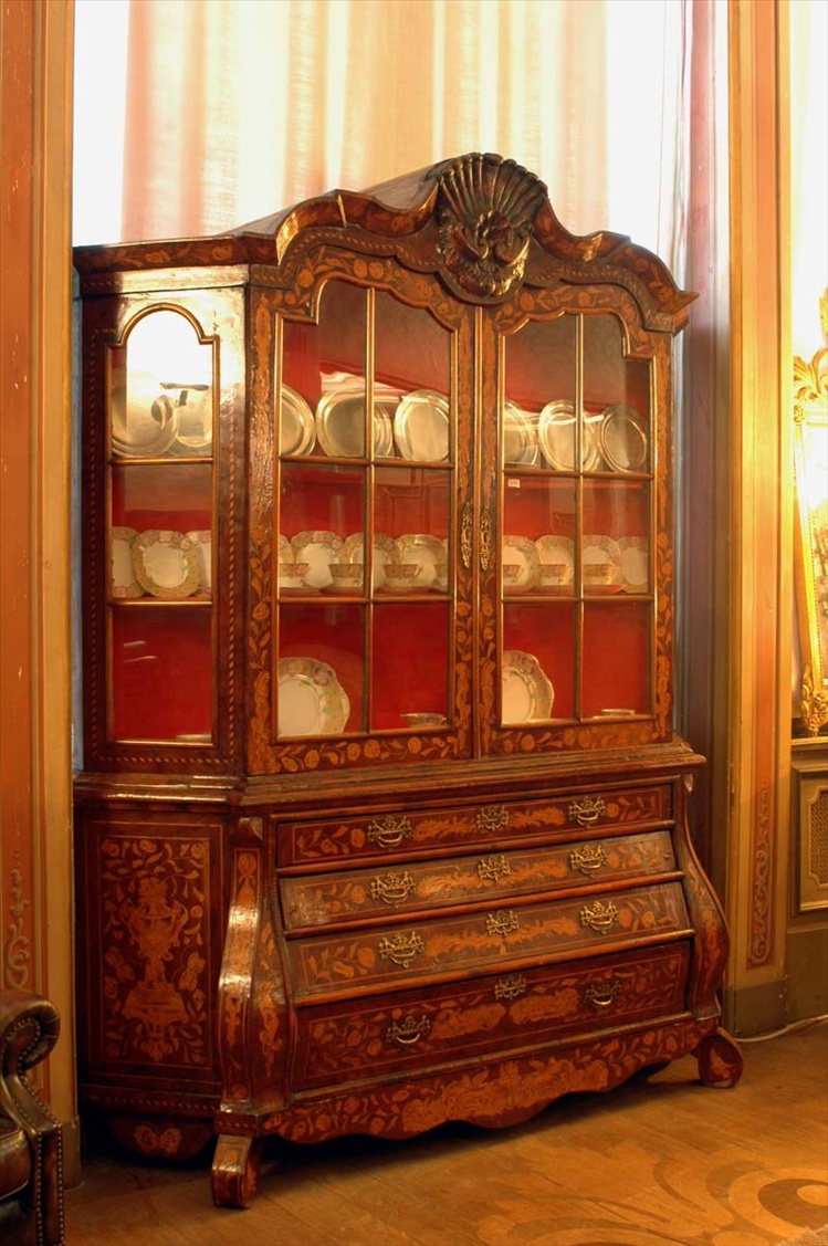 Sideboard, from the Italian manufacturer Mice. The frame is made of wood. The sideboard consists of a transparent section and drawers. The doors are made of glass. The model is decorated with carved elements and incrostazioni. Fittings - metal.