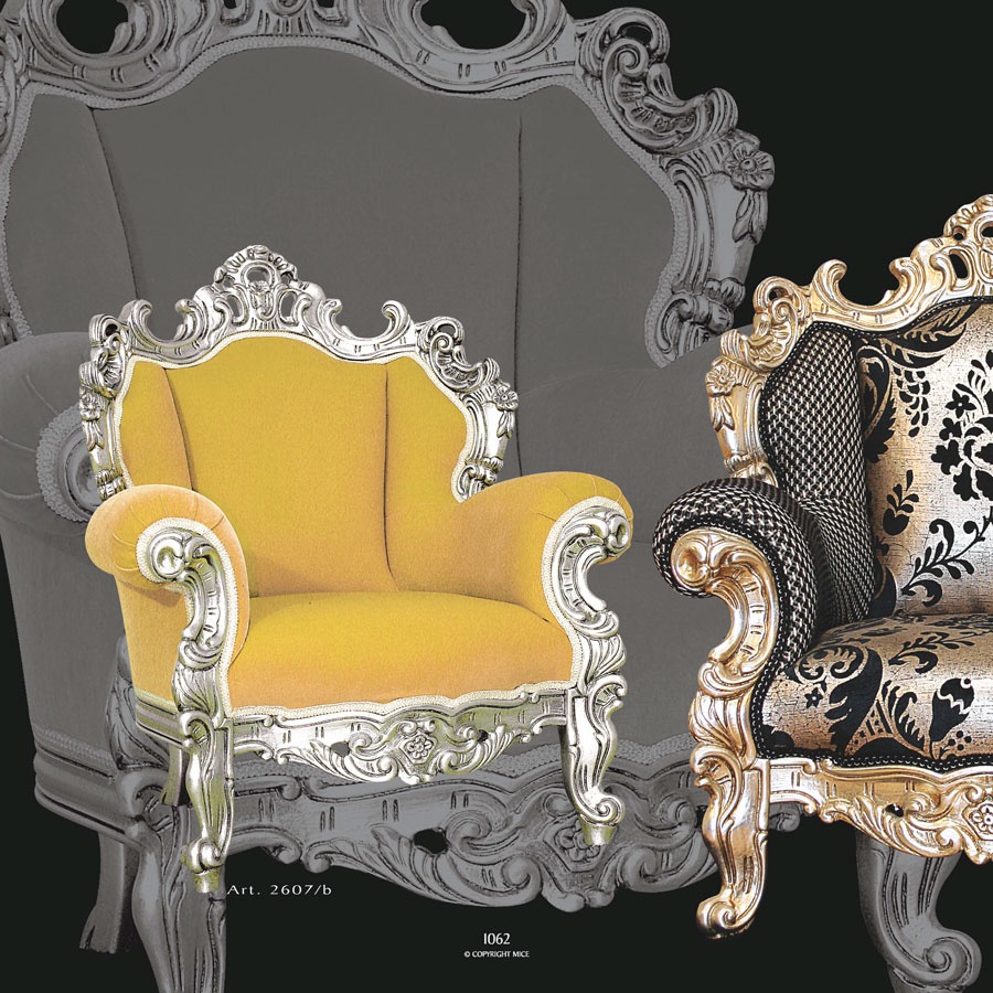 Armchair, from the Italian manufacturer Mice. The frame is made of wood. Upholstery - textiles from the company portfolio. The frame is decorated with carvings. The chair is made in a classic style.