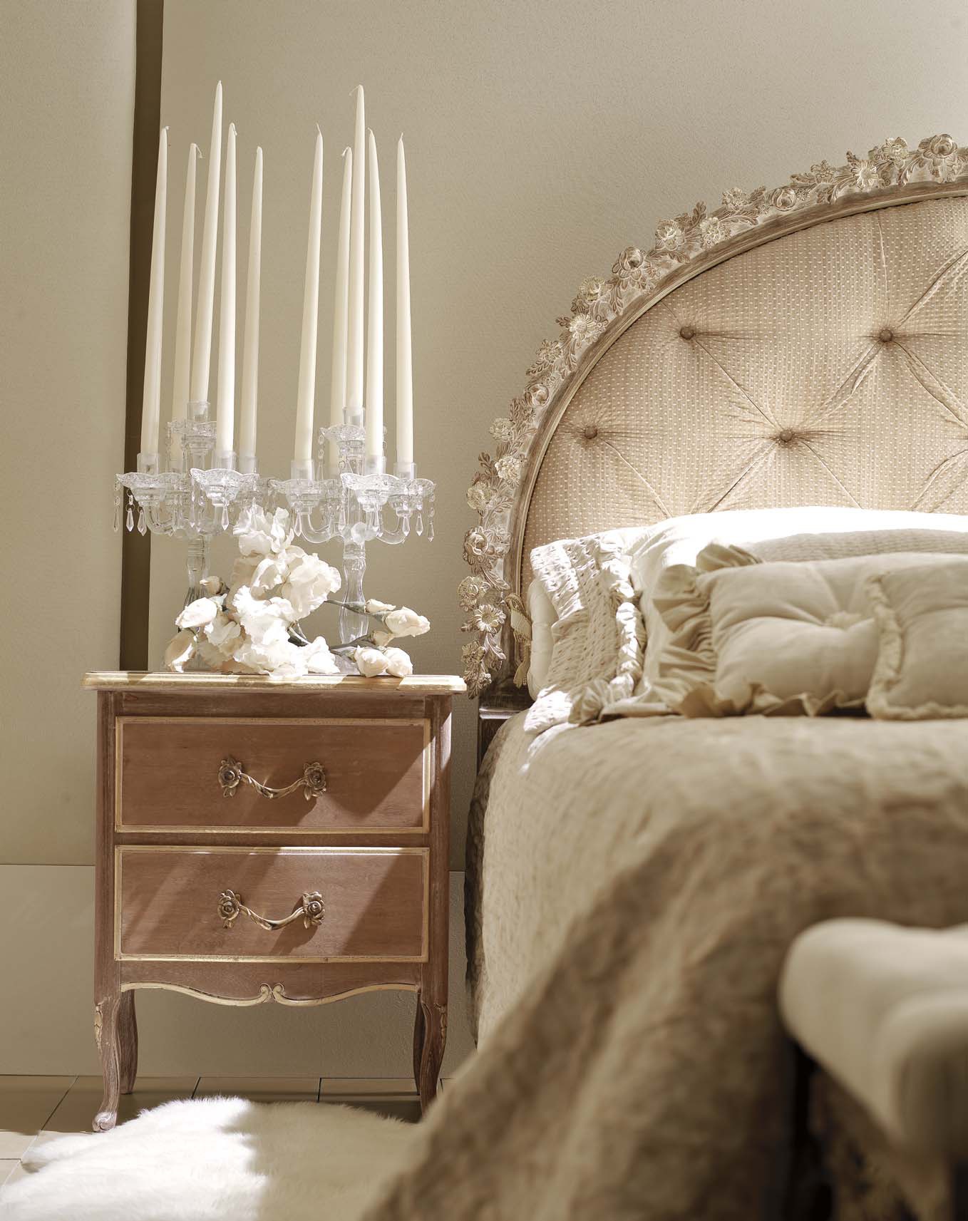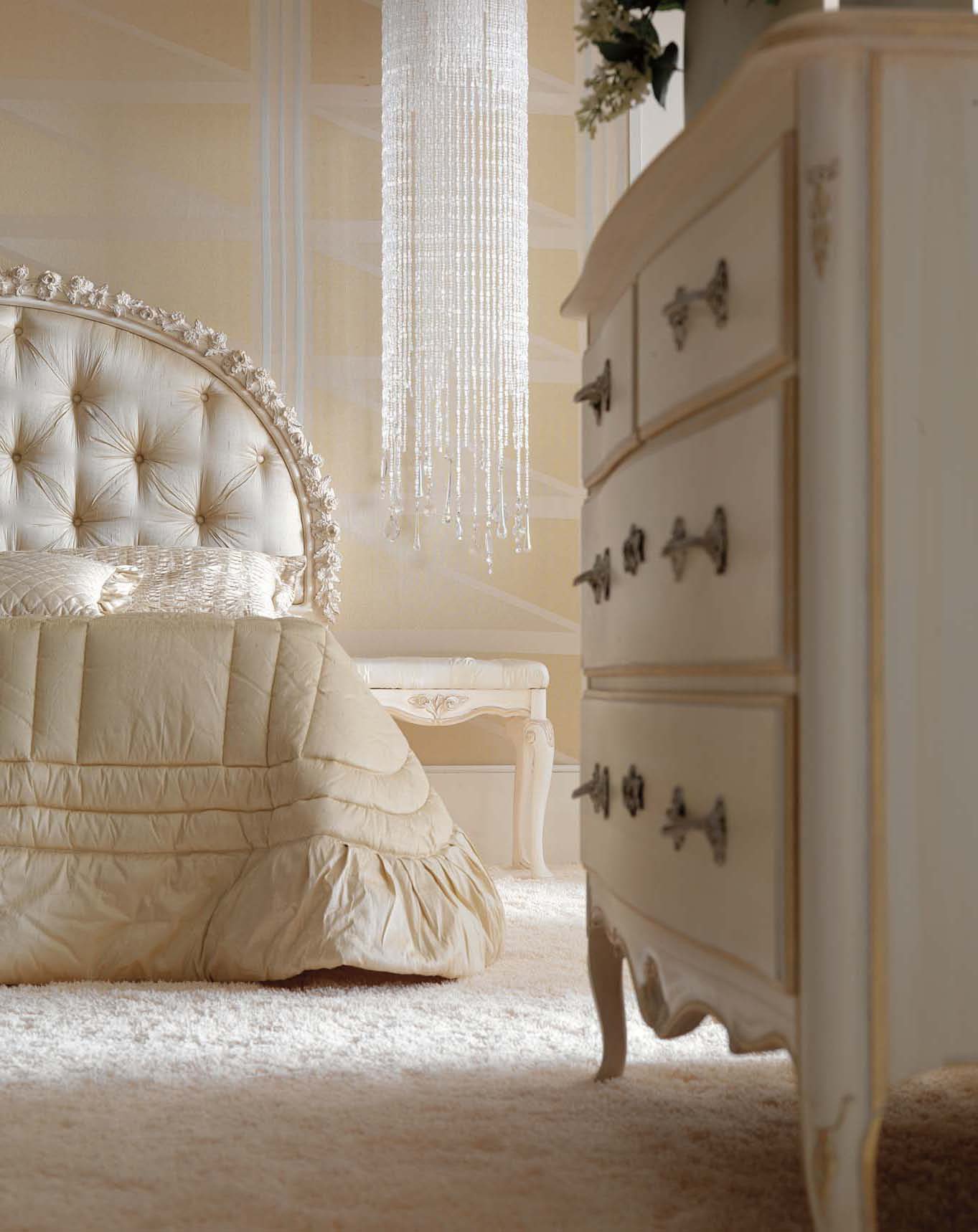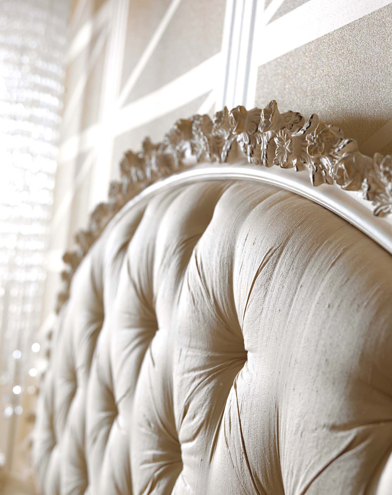 Double bed Ambiente Notte from the Italian manufacturer Savio Firmino. The bed is made in classic style. The product with high upholstered headboard, decorated with stitch-Capito and carved ornament, covered with white/Golden lacquer. Colors in white/Golden and beige tones. Amazing choice for light refined bedrooms.