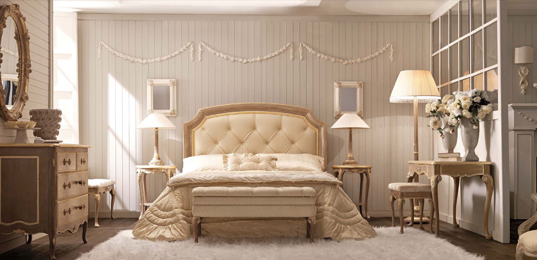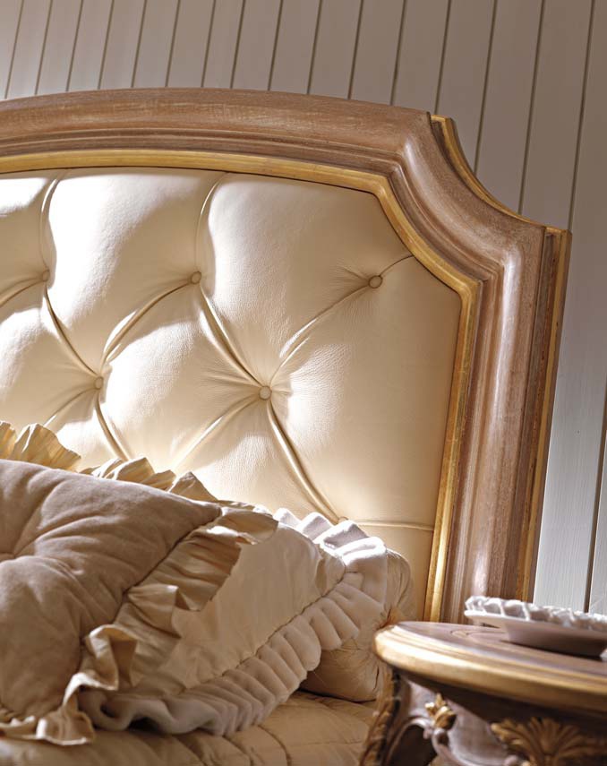 Double bed Ambiente Notte from the Italian manufacturer Savio Firmino. The bed is made in classic style, with high upholstered headboard. Headboard framed in a frame of solid wood covered with gold leaf. Upholstery - leather/textile from the company portfolio. Headboard decorated with fabric-Capito. This model in beige, perfect fit in a classic living room.
